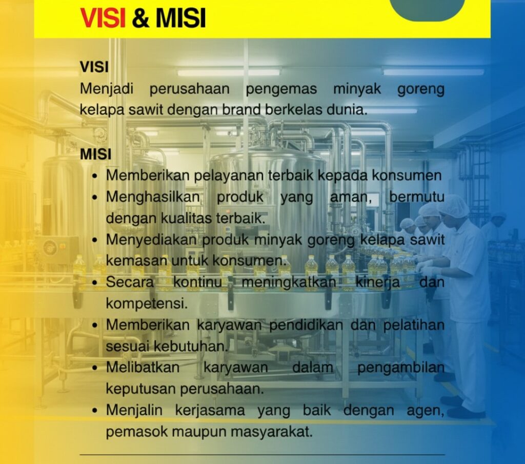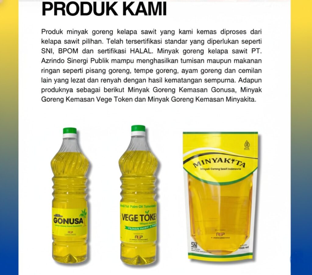 PT. Azrindo Sinergi Publik merupakan perusahaan jasa dan perdagangan yang didirikan pada tanggal 23 Januari 2021, saat ini fokus pada indsutri jasa pengemasan minyak goreng dan perdagangan. Perusahaan ini memilki jaringan perdagangan di beberapa wilayah Indonesia. Perusahaan kami selalu memberikan pelayanan yang maksimal dan berkualitas dari produk yang kami berikan berikan. Kami memilki perusahan operator yang mendistribusikan produk kami yaitu PT. ARIANT SINERGI KARYA dan PT. AZRINDO SINERGI PANGAN.